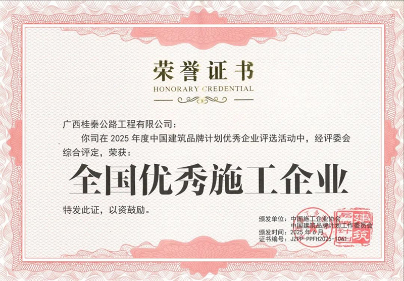 廣西桂秦公路工程有限公司獲評全國優(yōu)秀施工企業(yè)